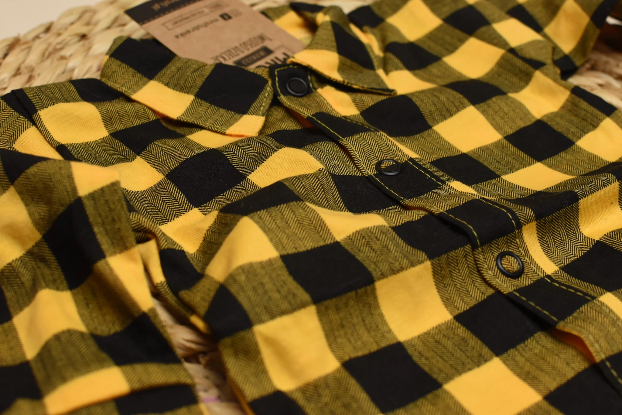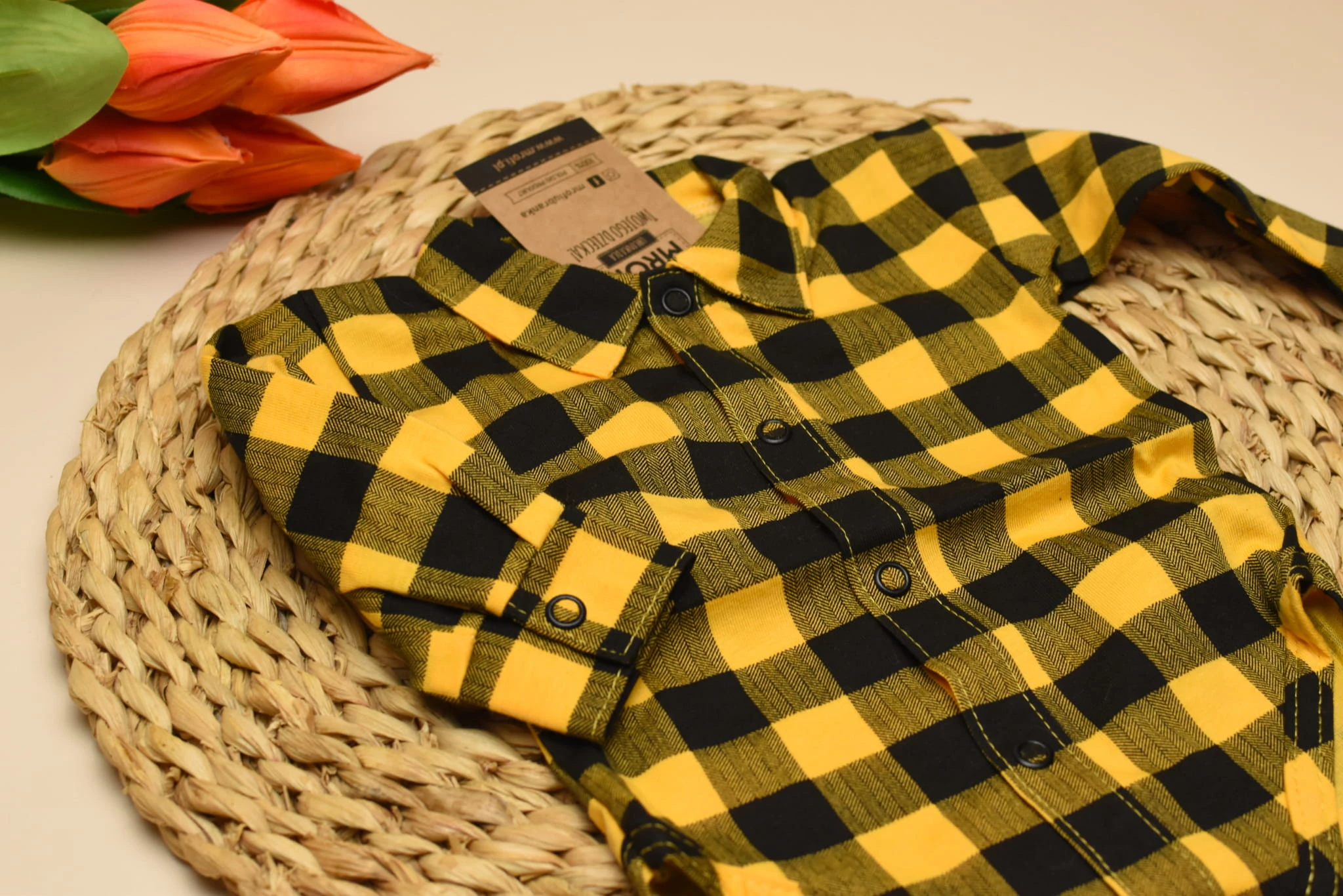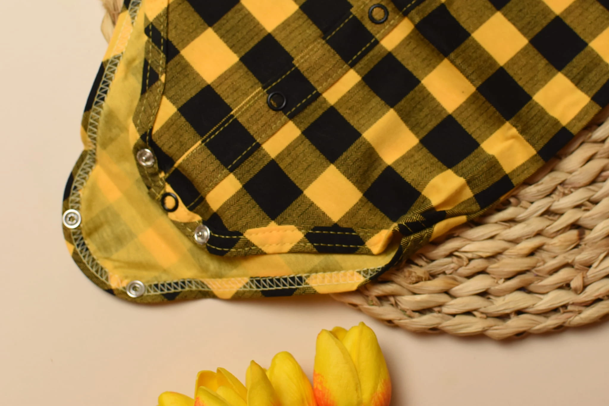 Eleganckie żółte body w kratę z kołnierzykiem i rozpinanymi mankietami. Wykonane z 100% bawełny, zapinane po całej długości na zatrzaski w kolorze czarnym. Zatrzaski wyprodukowane bez niklu - nie uczulają i nie podrażniają skóry dziecka.