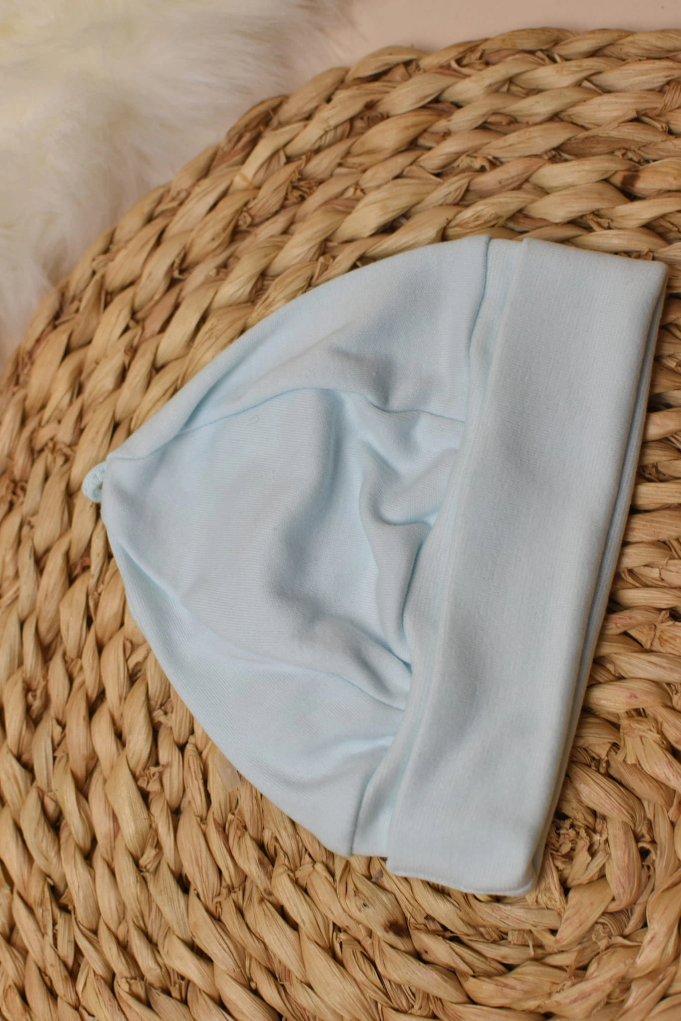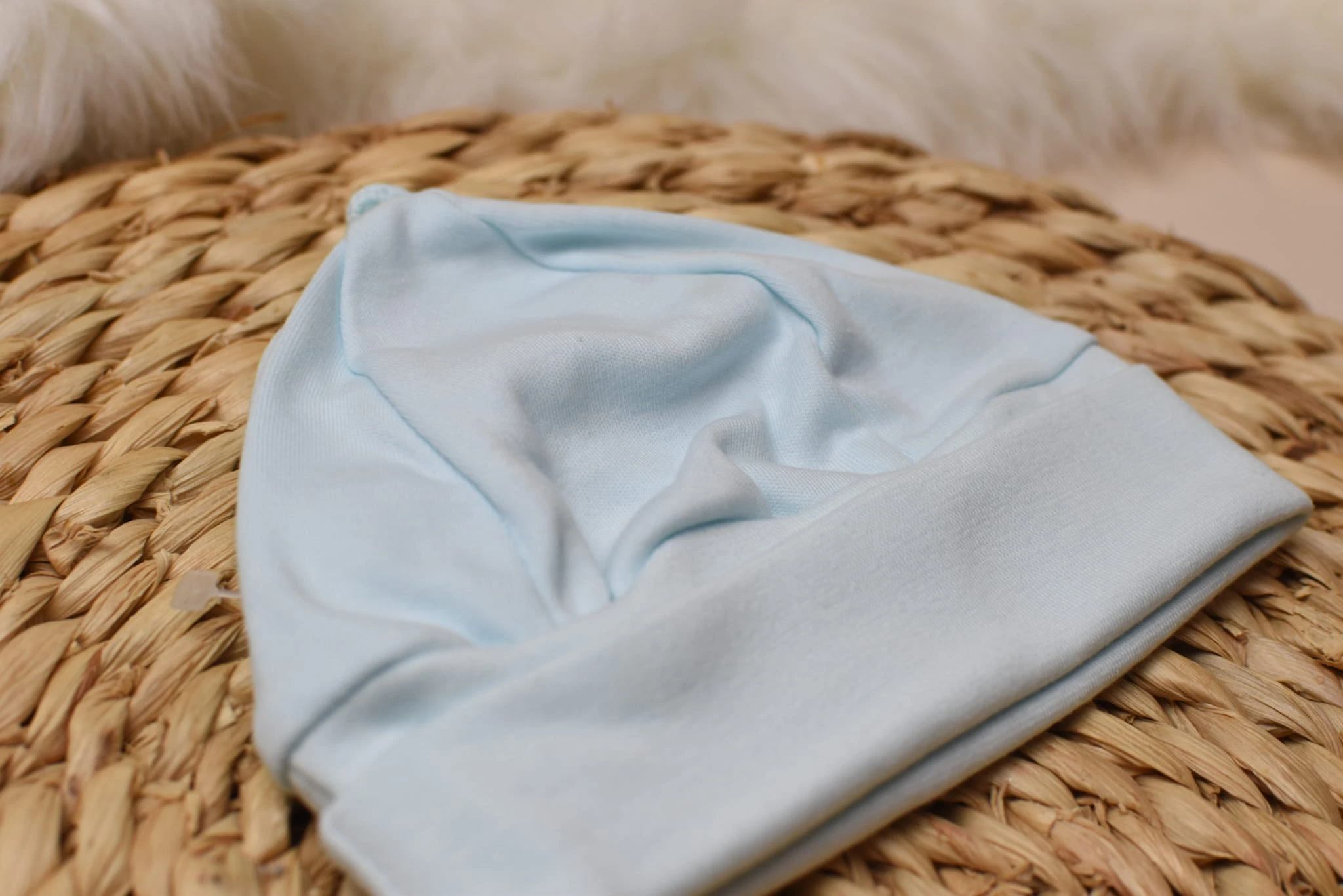 Czapeczka niemowlęca jest w kolorze pastelowym niebieskim w kształcie, tzw. balonika. Jest wykonana z elastycznej bawełny 100%. Posiada bez uciskowy ściągacz oraz ozdobną pętelkę na czubku. Świetnie się sprawdzi jako ochrona po kąpieli albo ubiór na wiosenny spacer. Do wyboru w różnych kolorach.
