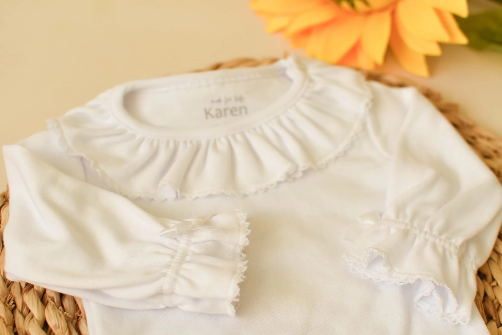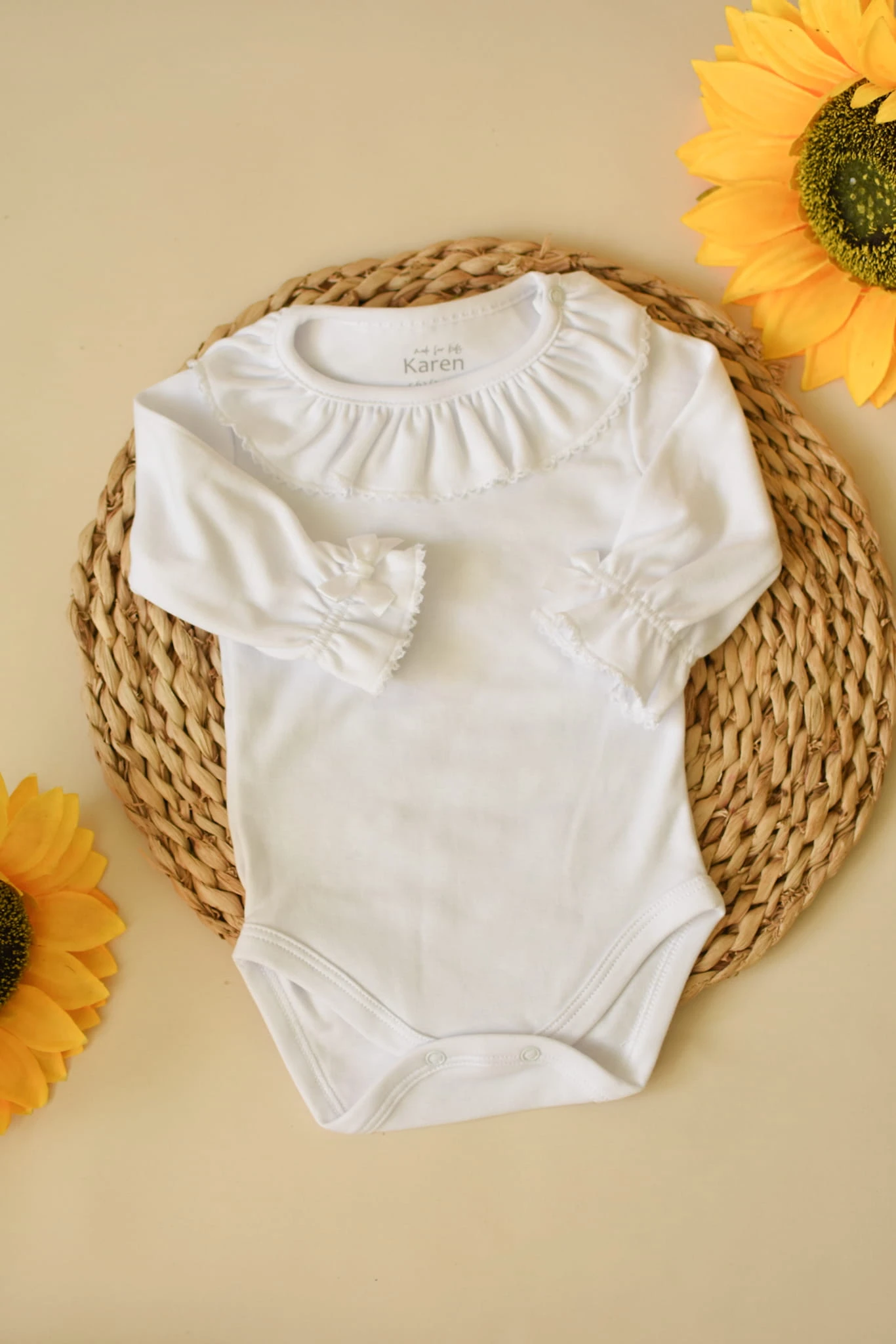 Eleganckie białe body z długim rękawem z ozdobną falbanką przy kołnierzu i na rękawkach. Wykonane z 100% bawełny. Zapinane na ramieniu i w kroku na zatrzaski. Zatrzaski wyprodukowane bez niklu. Idealnie sprawdzą się jako dodatek do eleganckiego stroju.