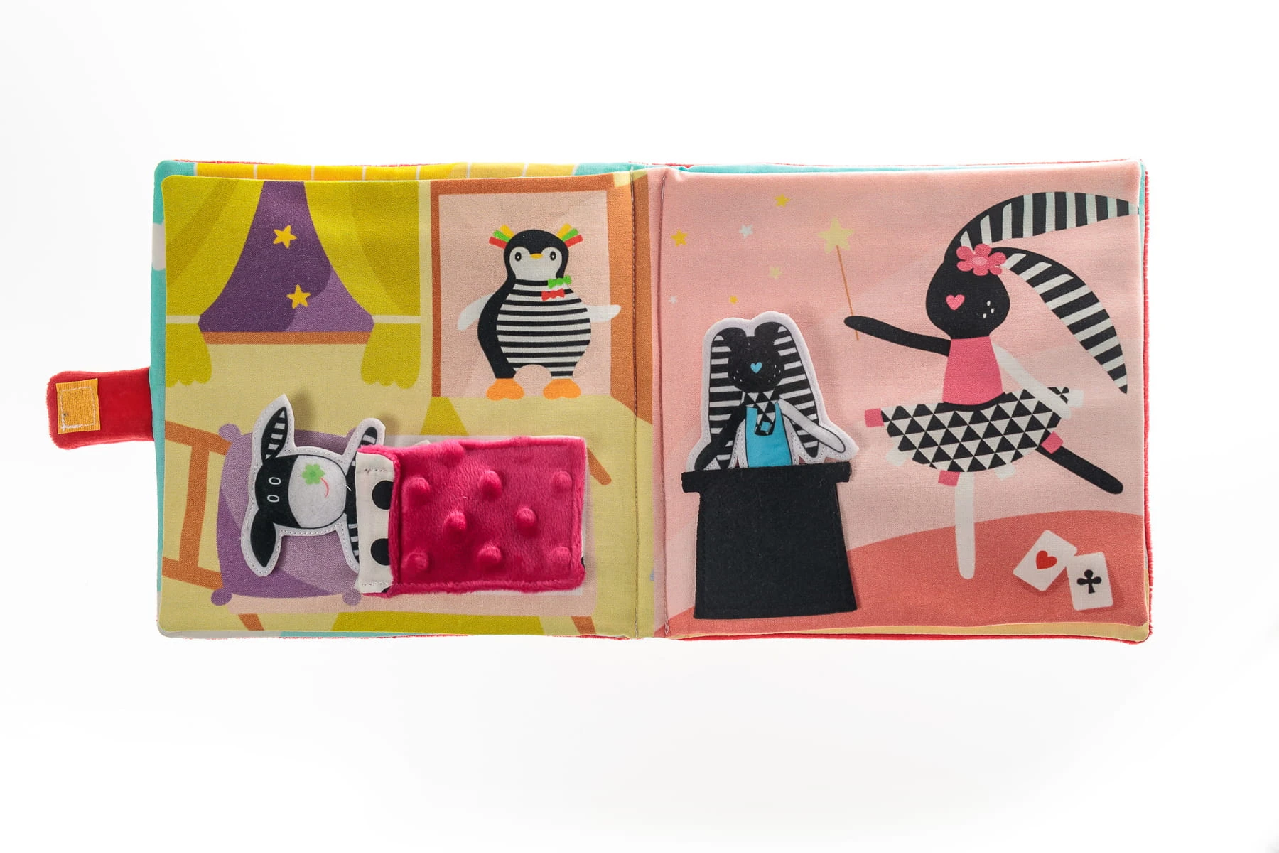 - Różne faktury materiałów – bawełna, frotte, minky, filc – pobudzają zmysł dotyku,