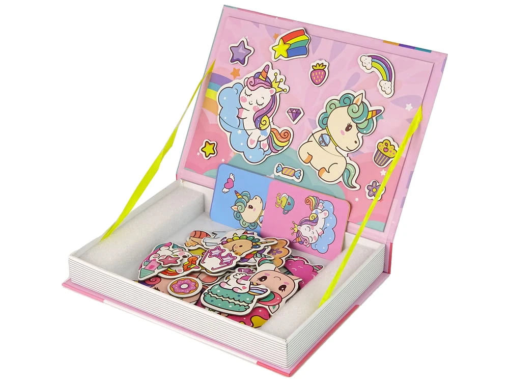 W zestawie znajdują się karty przedstawiające słodkie jednorożce, zadaniem malucha jest ułożenie magnetycznych elementów według wzoru, aby całkowicie odwzorować dany obrazek.